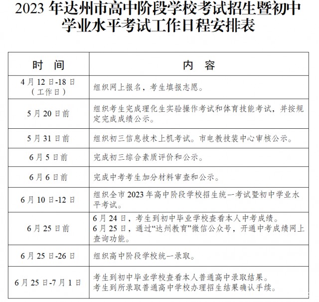 注:高中阶段招生相关政策、考生成绩等级及录取结果在官方微信公众号“达州教育”上发布,敬请关注!